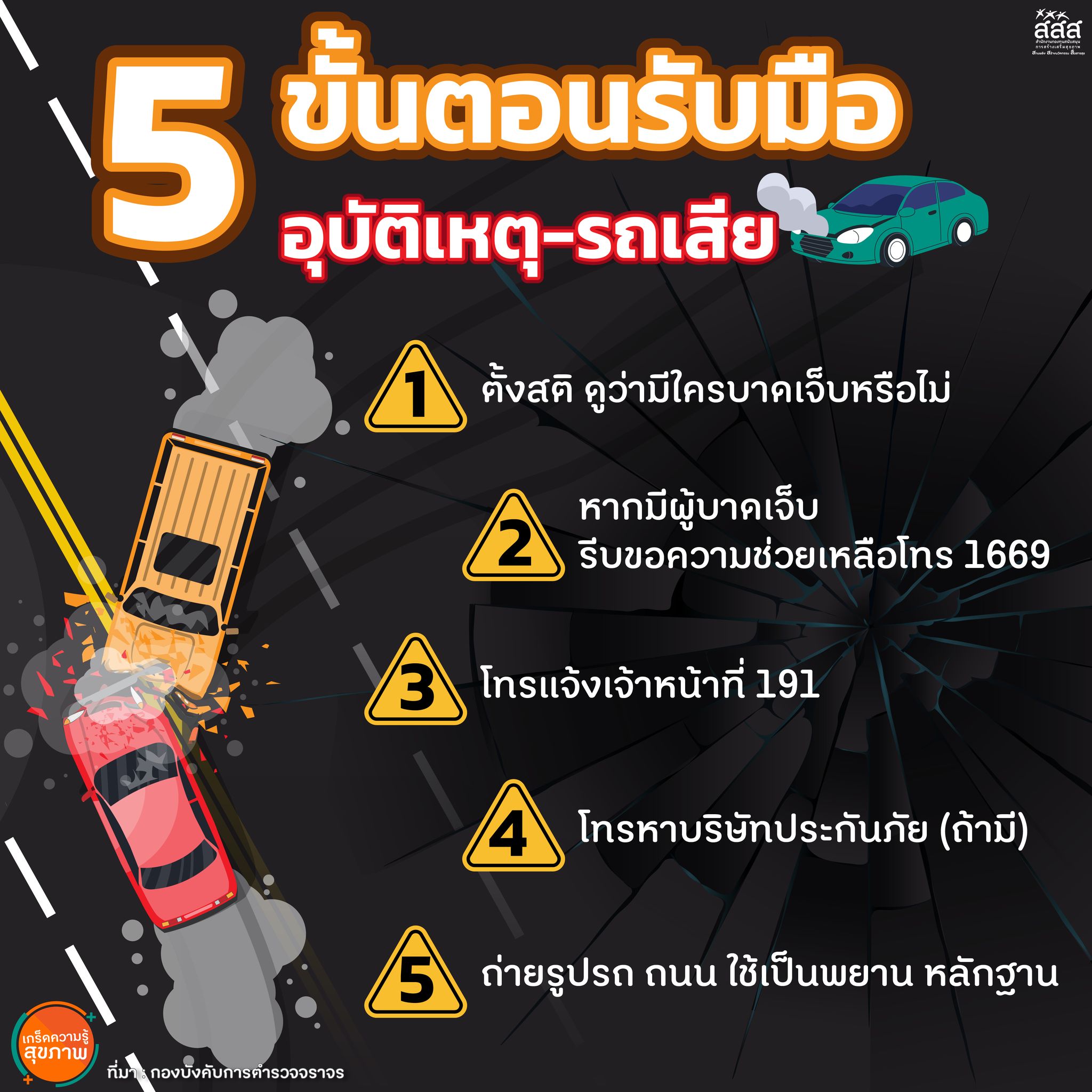 5 ขั้นตอนรับมือ เมื่อเกิดอุบัติเหตุ-รถเสีย 1. ตั้งสติ ดูว่ามีใครบาดเจ็บหรือไม่ 2. หากมีผู้บาดเจ็บ รีบขอความช่วยเหลือโทร 1669 …
